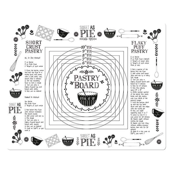 The board features recipes for shortcrust and flaky pastry and a guide for rolling pastry to the correct tin size.