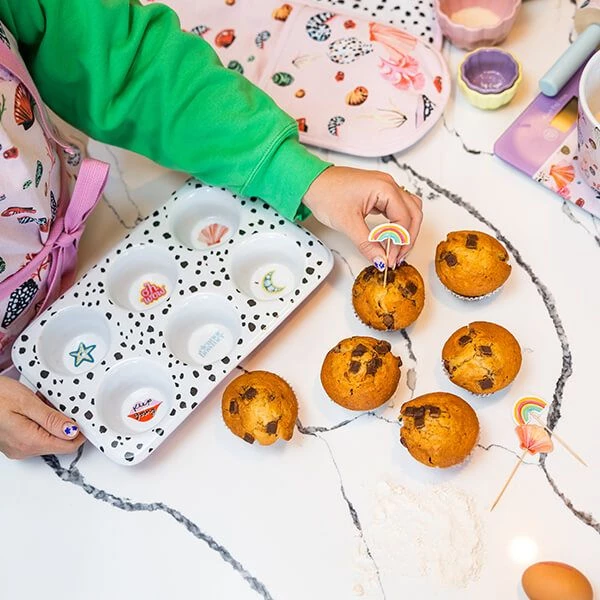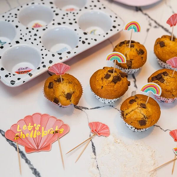 This cupcake and cake topper set features cupcake cases printed with Eleanor Bowmer’s ‘Miami Shells’ and ‘Dalmatian’ Dot prints.