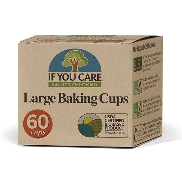 If You Care FSC Certified Large Baking Cups are perfect for both sweet and savoury goods. Made from unbleached, totally chlorine-free (TCF) greaseproof paper, these baking cups have easy release properties perfect for use to make cupcakes, muffins, mini quiches and other recipes. All If You Care paper products are complete chlorine-free and therefore no chlorine derivatives will be dumped into lakes, streams or rivers. Set includes 60 large baking cups.