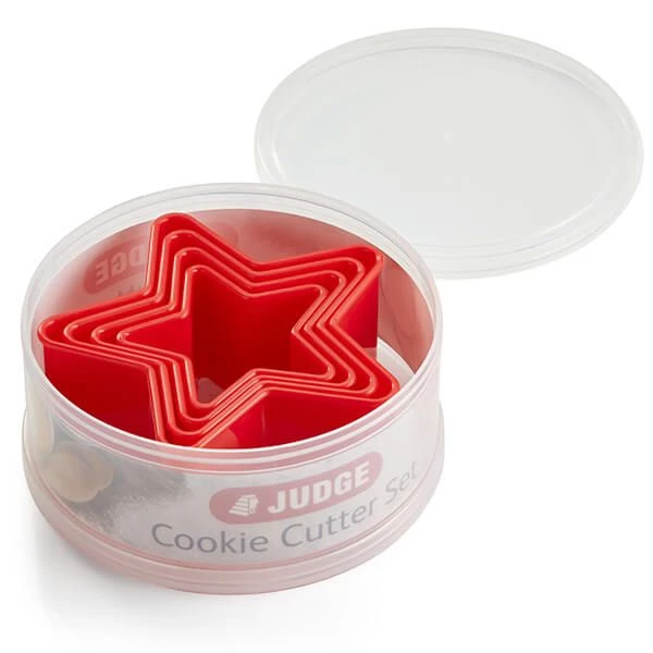 This set of 5 star shaped cookie cutters by Judge are provided in a plastic box for hygienic storage and accessibility.