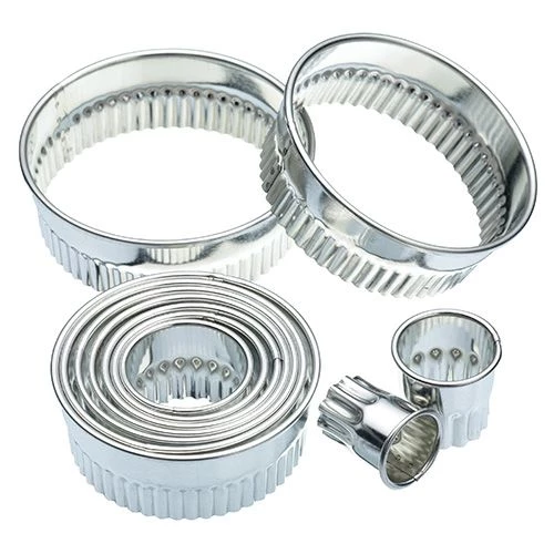 Kitchen Craft set of eleven metal round shaped cutters with a fluted edge, ideal for making jam tarts, canapes, pastries, and mince pies.