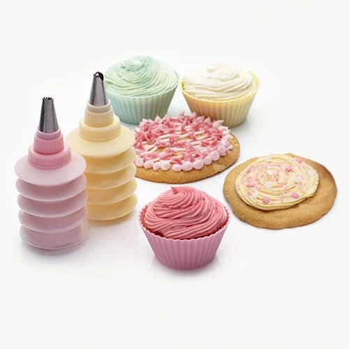 Four piece cookie and cupcake decorating kit to add decorating touches to cookies, cakes and cupcakes. Four easy to squeeze icing bottles come complete with a selection of durable stainless steel nozzles and lids for storing left over icing. This set offers everything you need to bring your cake decoration to perfection.