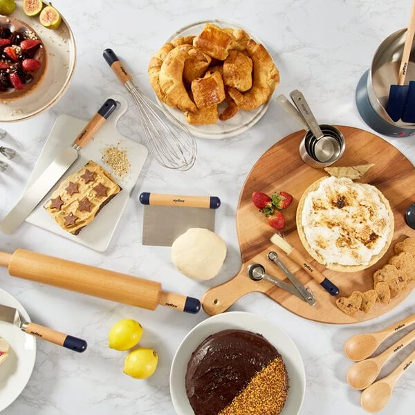 The blade of this bench scraper is made from stainless steel and is handily marked with both centimetre and inch measurements for when cutting precision bakes is required. The solid beech wood grip handle is attractively finished with harbour blue dipped ends.