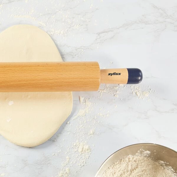 The natural weight of this solid beech wood Zyliss rolling pin ensures smooth and even rolling of pastry, dough or pasta. This stylish rolling pin features comfortable, contoured handles with harbour blue dipped ends that provide a superior grip when rolling.